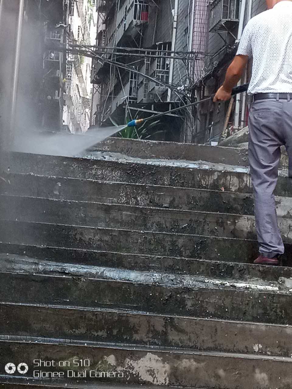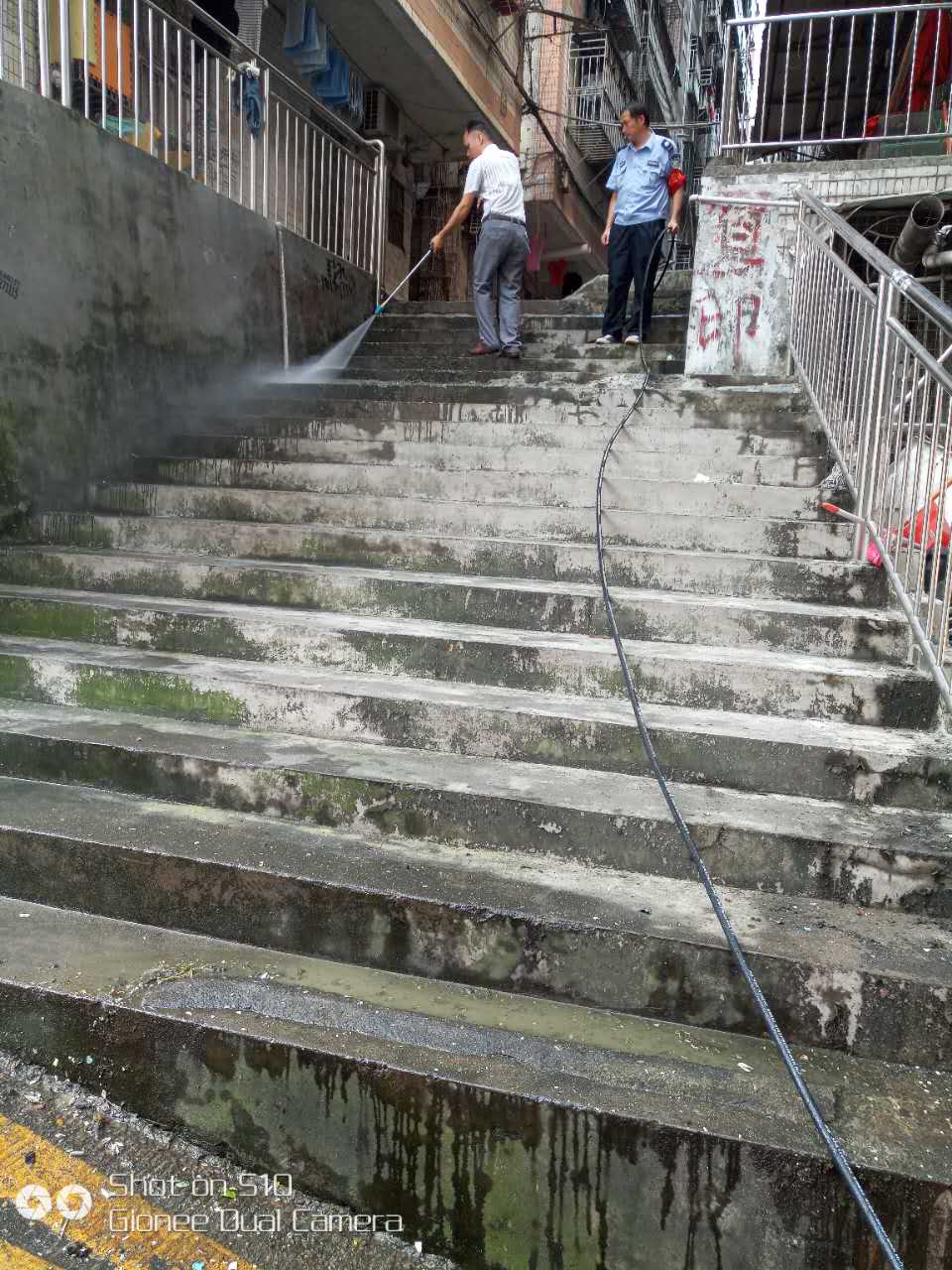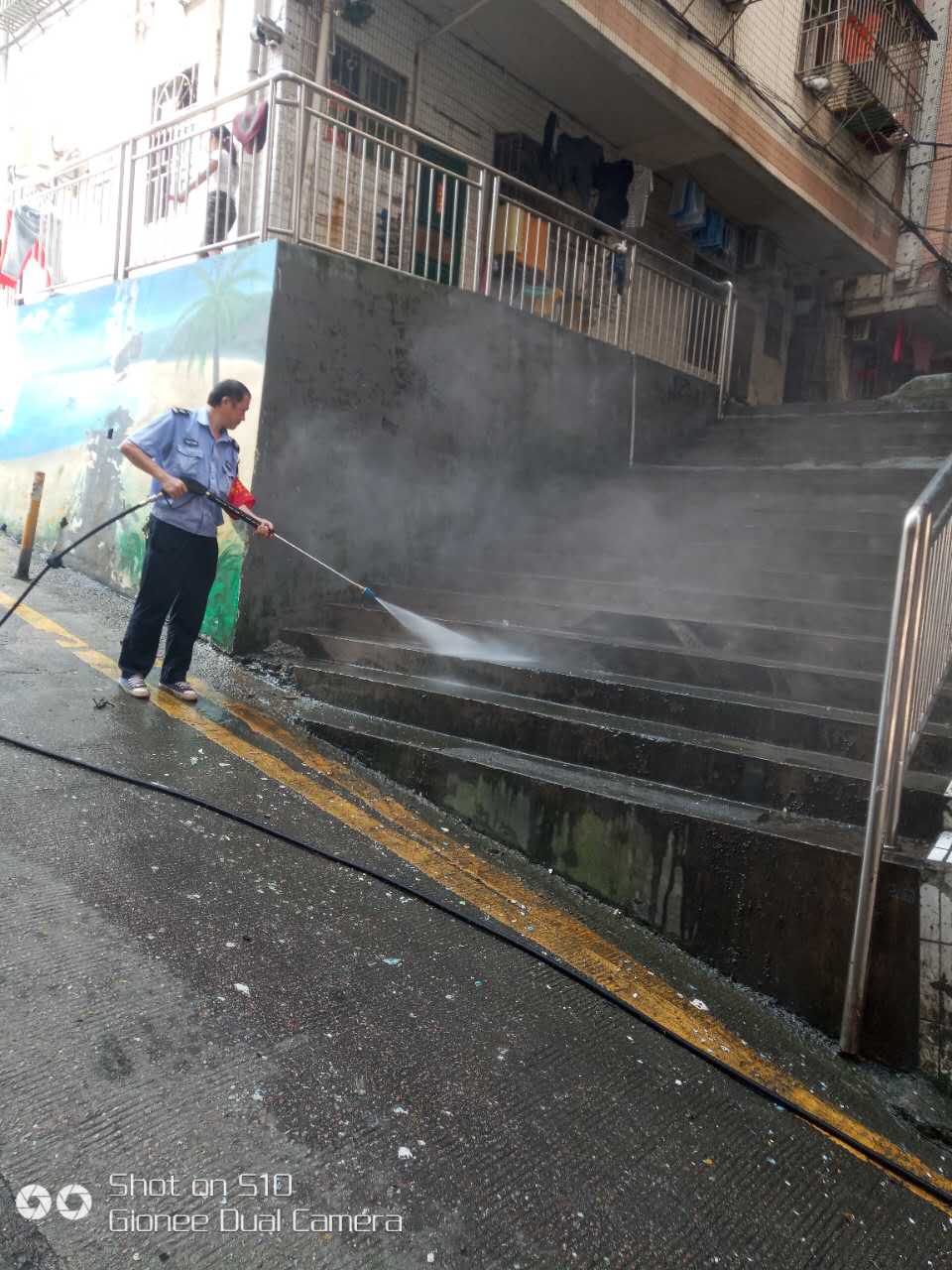 布吉新村物业服务中心用高压水车清理小区路面、台阶