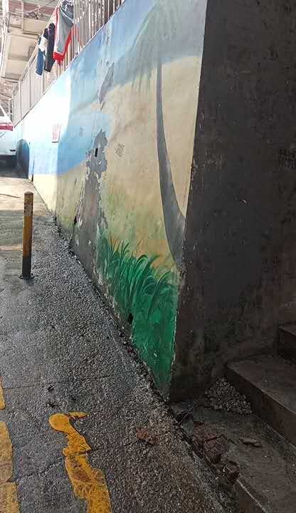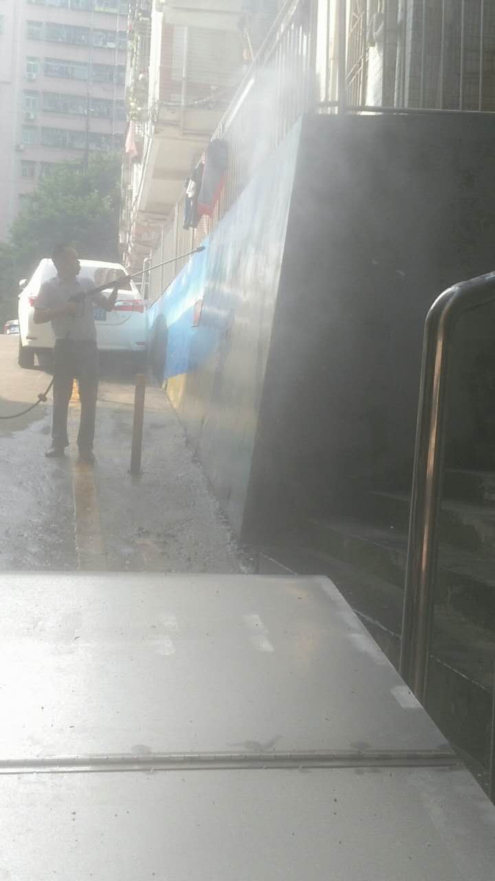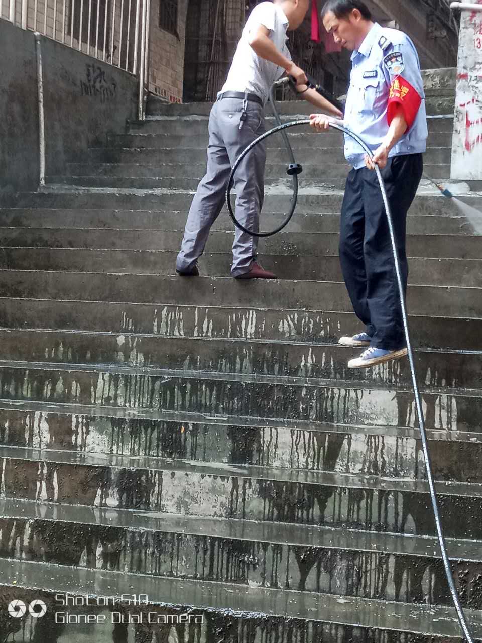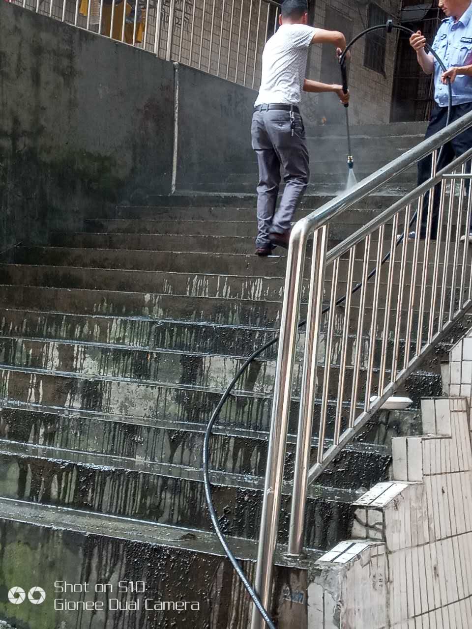 布吉新村物业服务中心用高压水车清理小区路面、台阶